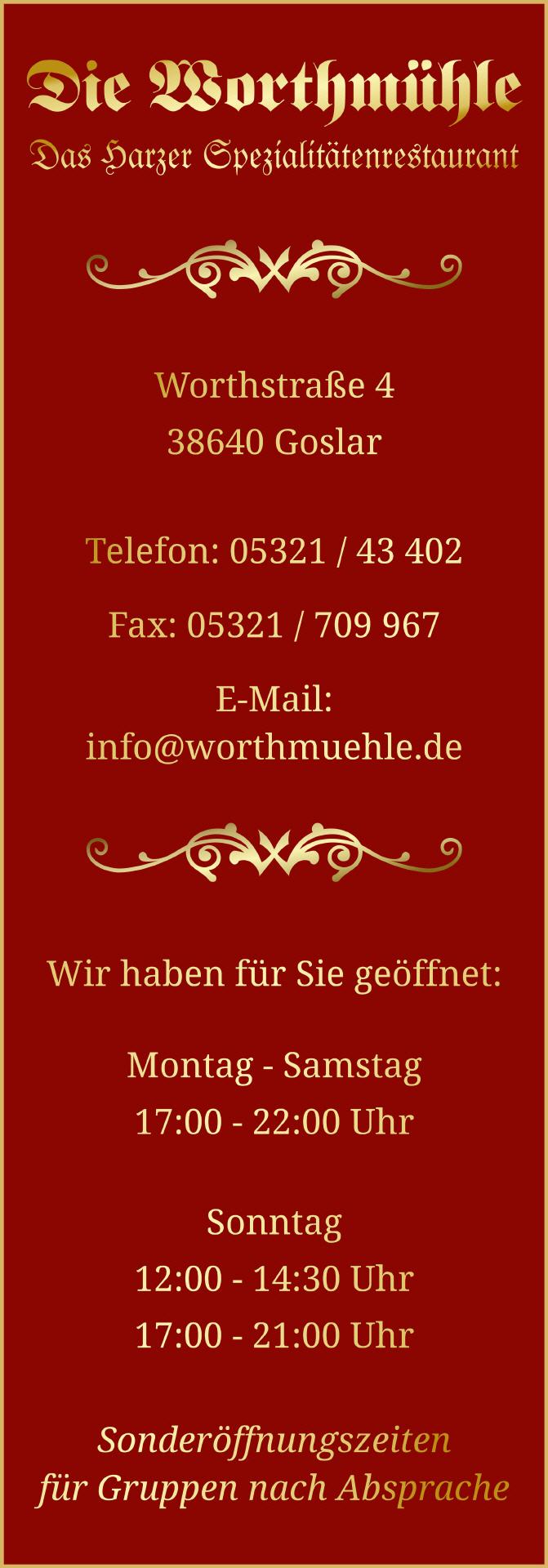 In der einzigartigen Atmosphäre unseres urig-originellen Restaurants "Worthmühle" begrüßen wir Sie im Zentrum Goslars, mitten im Herzen der alten Kaiserstadt. Nur wenige Schritte vom historischen Marktplatz entfernt, erwartet Sie bei uns die pure Gemütlichkeit.
